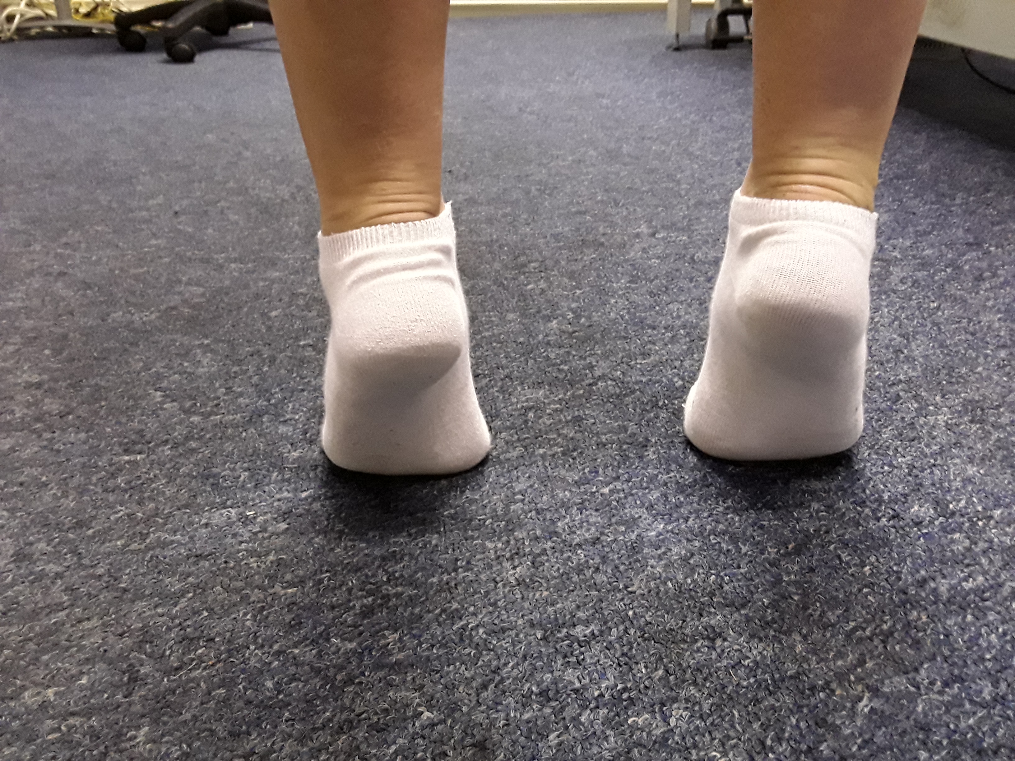What are we looking at specifically? It’s a not often looked for symptom and that is reduced tibialis anterior/posterior activation. Thus limiting inversion at the mid-foot in toe standing. In this case in the left foot.