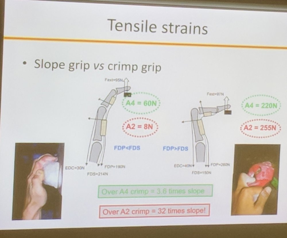 Today is all about the body – my favorite day. This slide shows the forces put through the A2 & A4 pulleys during a slope and crimp grip