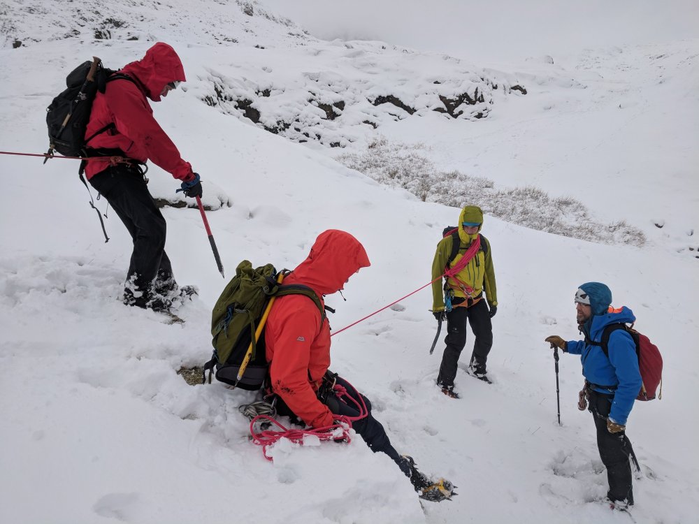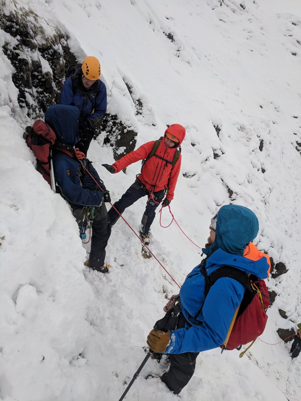 I had a fantastic few days in the hills with friends and colleagues walking, running, scrambling (occasionally falling off but that was planned). I spent two days working with fellow mountain professionals (Instructors, Leaders and Guides) on movement; walking but also scrambling, climbing and ‘short-roping’ – this is where we (guides) protect clients from falling on relatively easy but fatally consequential terrain. What was nice was seeing principles of movement, normally the preserve of the coaches you see at walls being adopted and used in the hills. I enjoyed contributing to this and learning from it.